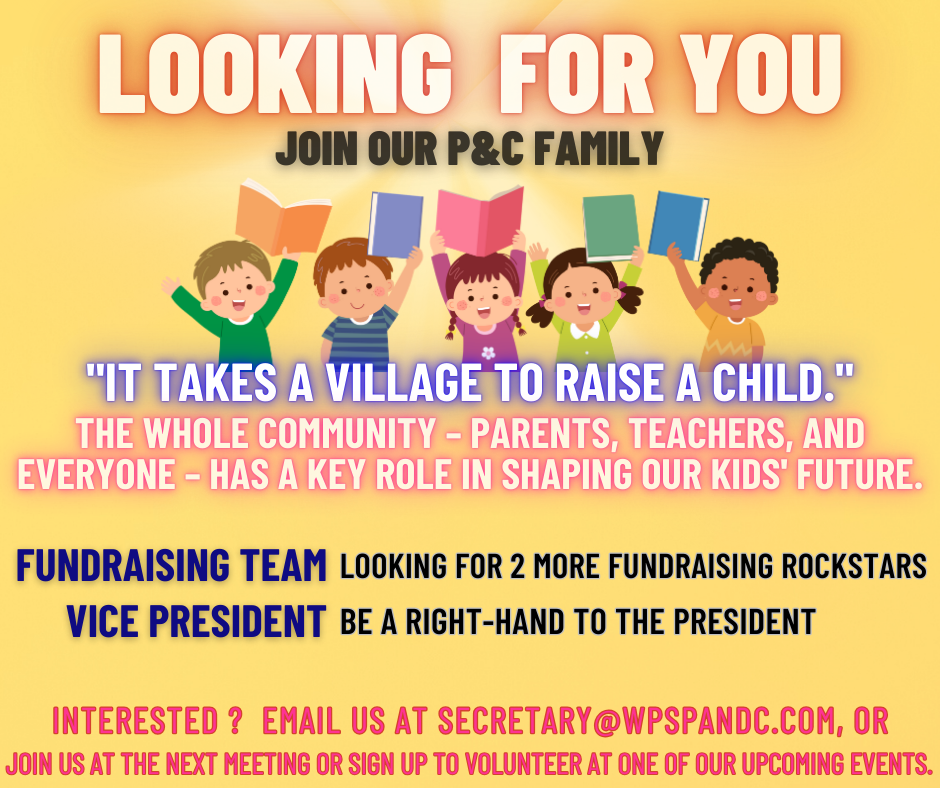 the role. To learn more about these roles or to discuss them further, please reach out to our secretary at secretary@wpspandc.com. Alternatively, we invite you to attend one of our meetings and engage with us firsthand. Upcoming meeting details: P&C Meeting Dates.